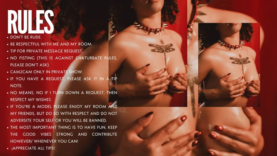 아헤가오, 카멜토우, 음란한 대화, 스트립쇼, 페이셜, 오일 쇼, 스모킹, 상의탈의, 트월킹, 딜도 또는 바이브레이터, 스팽킹, 에로틱 댄스, 핑거링, 풋 페티시, 블로우잡, 자위, 젖치기, 핸드잡, 하드코어, 분수, Spread pussy, Slap ass, Oil tits, Oil full naked, Oil ass, 도기 스타일, 딥스로트, 굴욕, 애널 기구, 오르가즘, 샤워, 더블 페네트레이션, 가죽, 애널